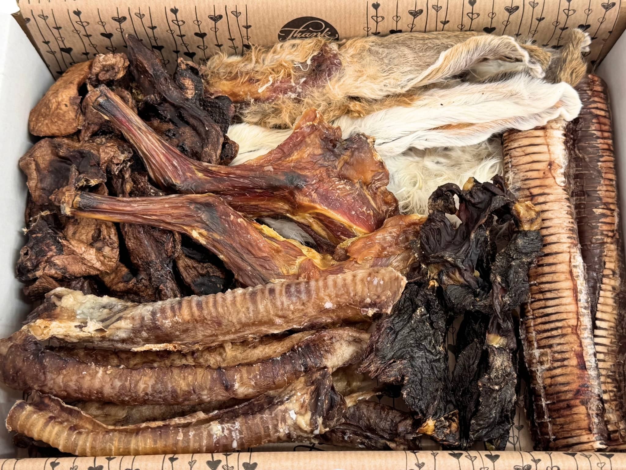 Természetes, hipoallergén jutalomfalat-válogatás nyúlból, bárányból és struccból. Minden boxban rejtőzik egy titkos tök nyereménnyel.