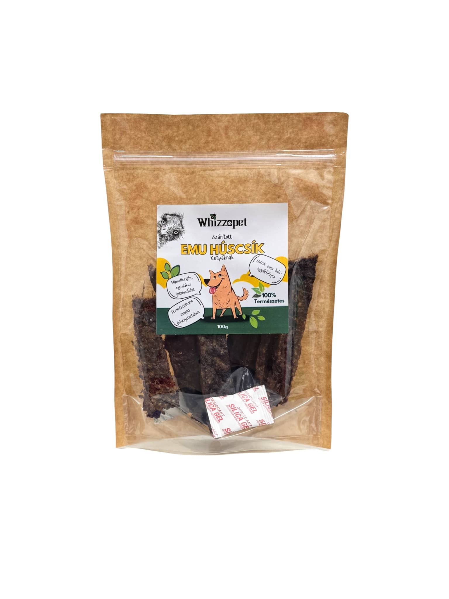 Whizzopet prémium szárított emu húscsík 100g-os kiszerelésben, visszazárható csomagolásban kutyáknak.