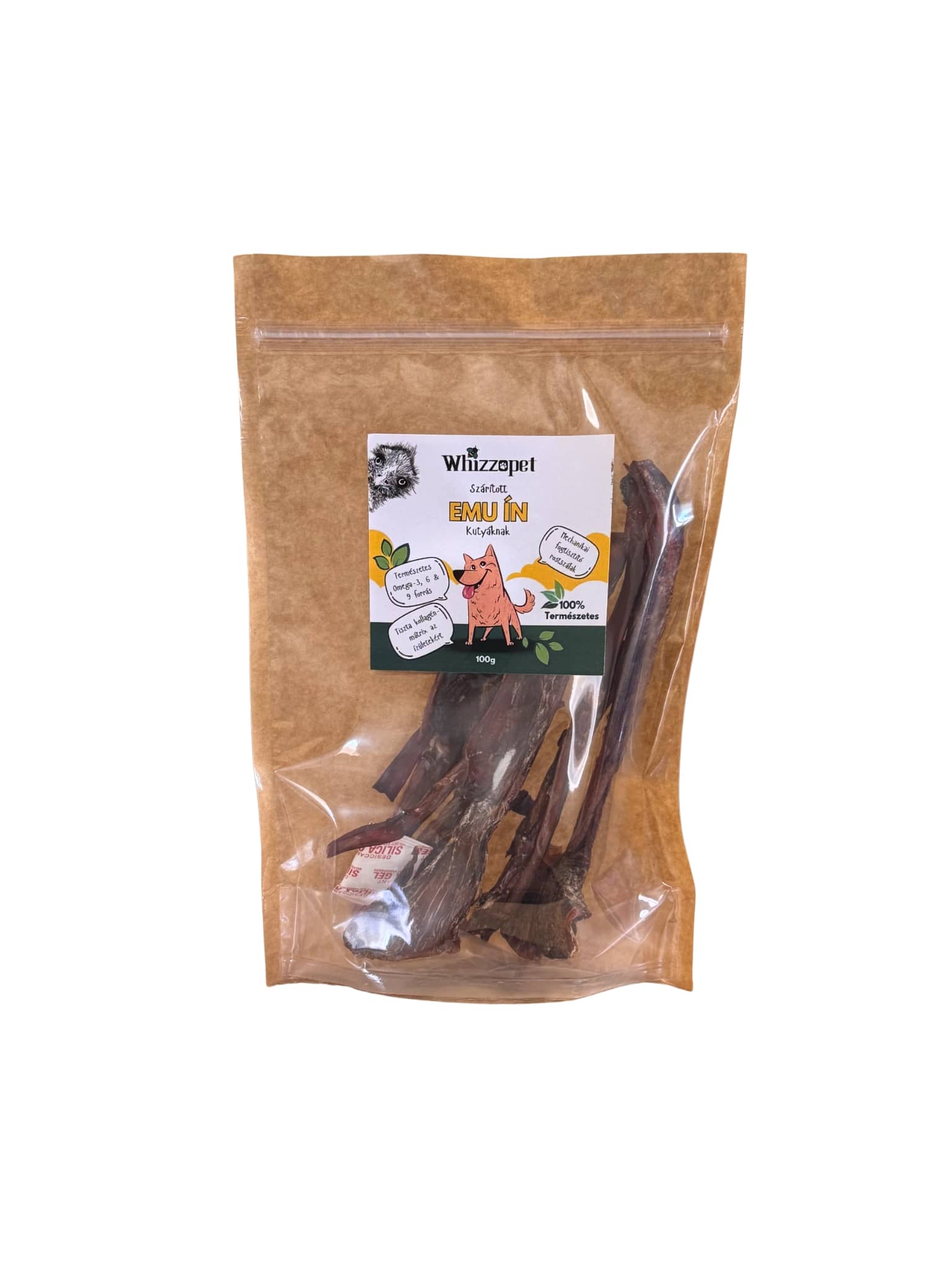Whizzopet szárított emu ín 100g-os visszazárható tasakban. Természetes, hipoallergén rágóka kutyáknak kollagénnel az ízületek védelméért.