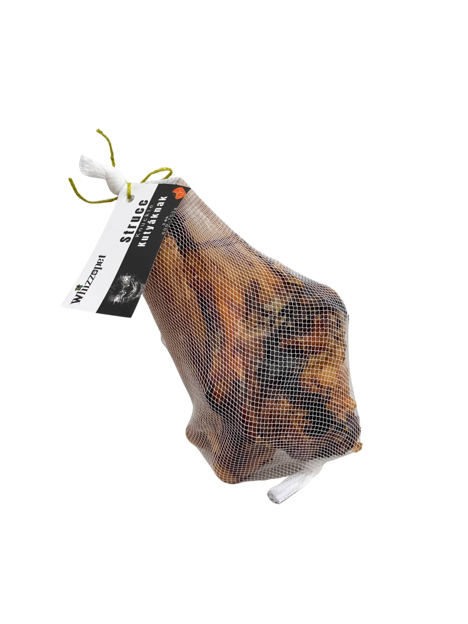 A Whizzopet szárított strucc knuckle kizárólag 100% strucc csontból készül. Nem tartalmaz adalékanyagokat, tartósítószereket vagy mesterséges ízfokozókat és nem füstölt. A szárítás célja a stabil, biztonságos rágócsont előállítása. Mivel természetes csonttermékről van szó, minden darab formája és mérete egyedi. Ez nem minőségi hiba, hanem a természetes alapanyag sajátossága.