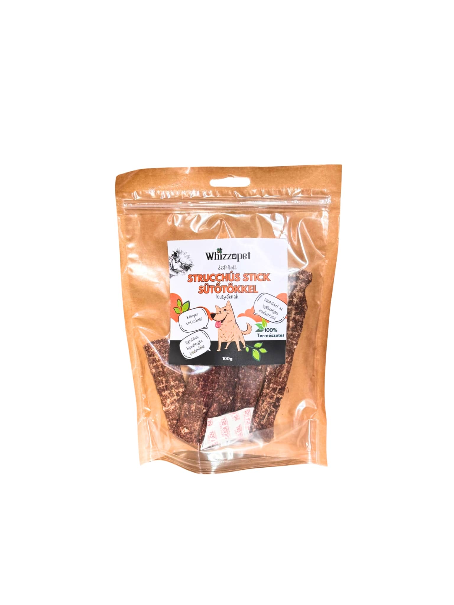A szárított strucchús csík jutalomfalat kutyának egy egzotikus, hipoallergén fehérjeforrás, mely sütőtökkel készül az emésztés támogatására.