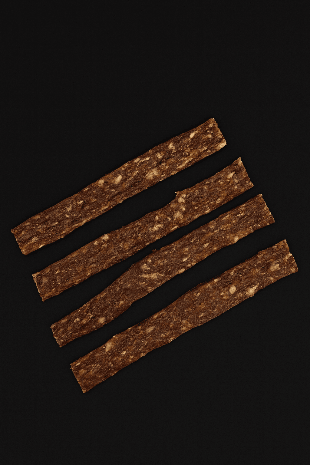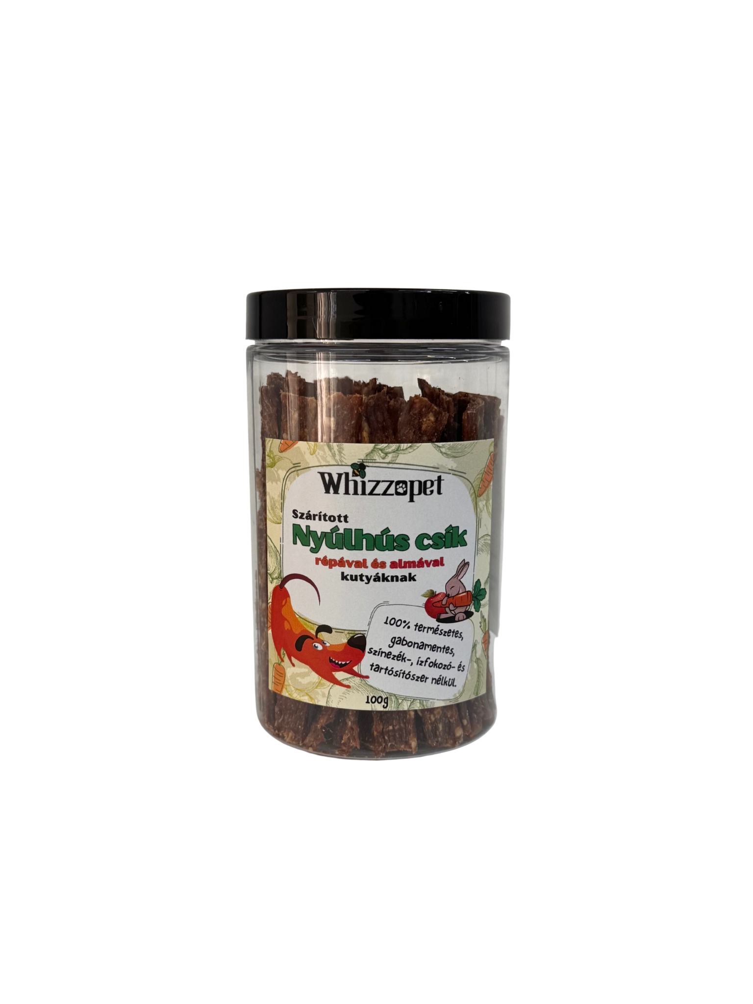 Szárított nyúlhús csík répával és almával, egészséges, természetes kutya jutalomfalat, amely ideális tréninghez és érzékeny gyomrú kutyáknak is.