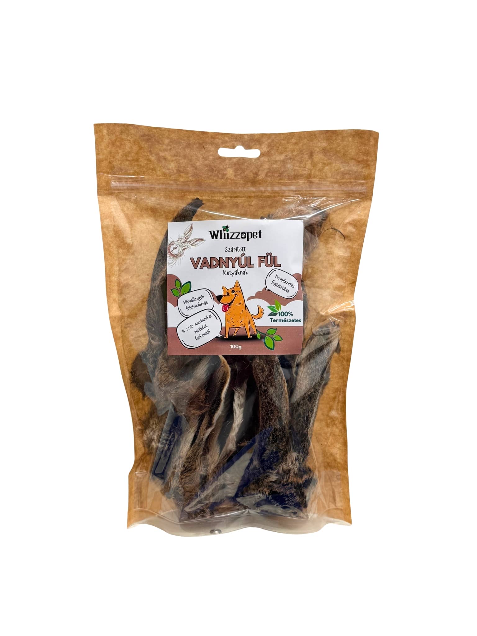 A termék 100% szőrös vadnyúl fül, kíméletesen szárítva, adalékanyagok, tartósítószerek és ízfokozók nélkül.